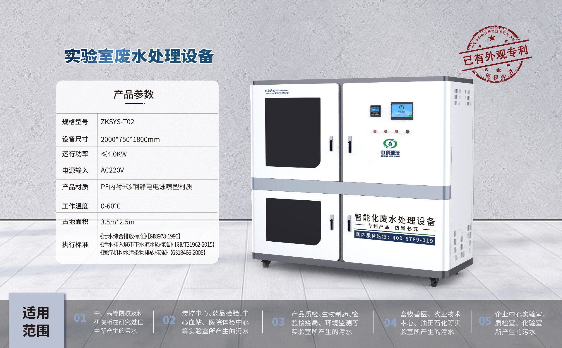 該設(shè)備被廣泛應(yīng)用于中、高院校、科研院所、醫(yī)療機(jī)構(gòu)、生物制藥、疾控中心、環(huán)監(jiān)、產(chǎn)品質(zhì)檢、檢疫檢驗(yàn)、藥品檢驗(yàn)、血站、畜牧、醫(yī)院、石油化工、企業(yè)等實(shí)驗(yàn)室、化驗(yàn)室的綜合廢水處理,憑借穩(wěn)定性能,優(yōu)質(zhì)處理結(jié)果,受到廣大客戶的一直好評(píng)。